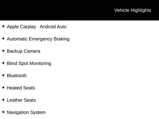 Apple Carplay Android Auto, Automatic Emergency Braking, Backup Camera, Blind Spot Monitoring, Bluetooth®, Heated Seats, Leather Seats, Navigation System, Rear Cross Traffic Alert, Remote Start, Sunroof/Moonroof, Parking Sensors.